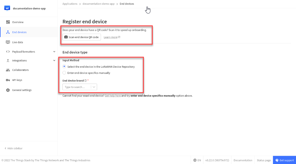 2. You will be presented with options to easily onboard your device using its QR code or register your end device from the LoRaWAN Device Repo or manually.
