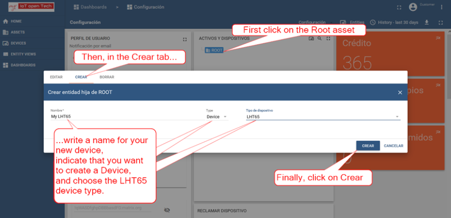 8. In the CREAR tab wite a name for your new Device, select “Device” for the element, choose LHT65 device type and click the CREAR button.