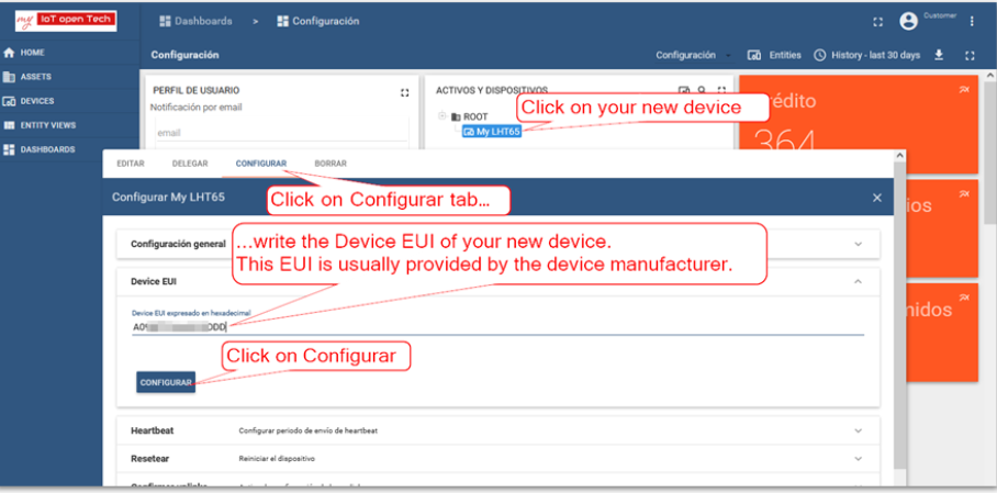 9. Click on your new Device that was just created to open its configuration box. In the tab “CONFIGURAR”, click on the drop down “Device EUI”, write the Device EUI of the device (copy paste from Things Stack)