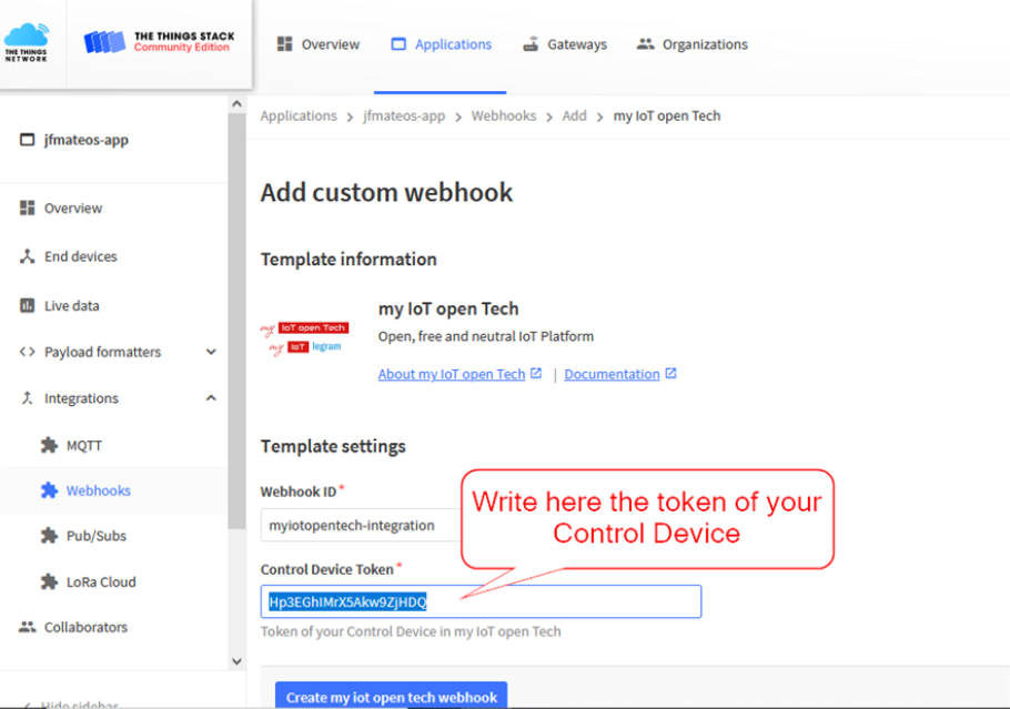 11. Select “Integrations” in the left pannel of your The Things Stack Community Edition application console. Then go to “Webhooks” and then press “Add webhook” button