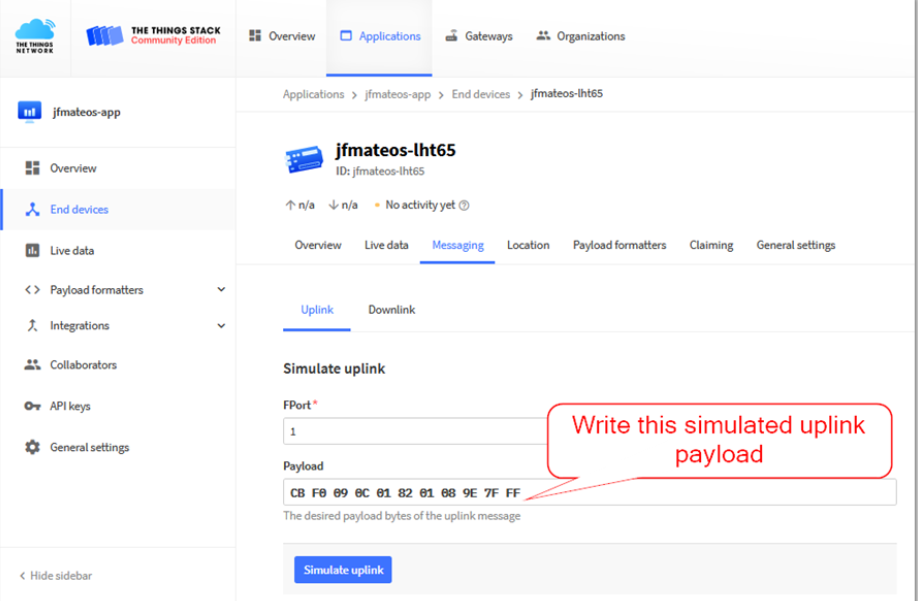 14. In The Things Stack Community Edition console, open the “Messaging” tab of your new device, write CBF0090C018201089E7FFF in the “Payload field” of the Simulate uplink section, and press the button “Simulate uplink”.