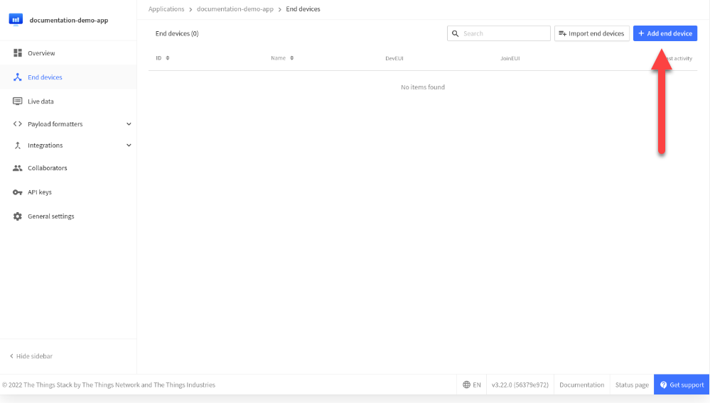 - To create a device, first open the “Application” tab, then open the “End Devices” Tab then click on “+ Add end device” to reach the end device regisration page.
